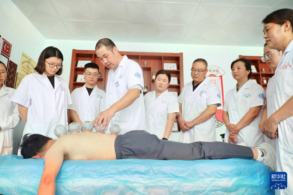 8月18日,在山东省滨州市沾化区下洼镇卫生院,医务工作者展示拔罐的方法。