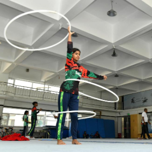 8月20日,来自孟加拉国的学员在河北吴桥杂技艺术学校排练厅内练习杂技。
