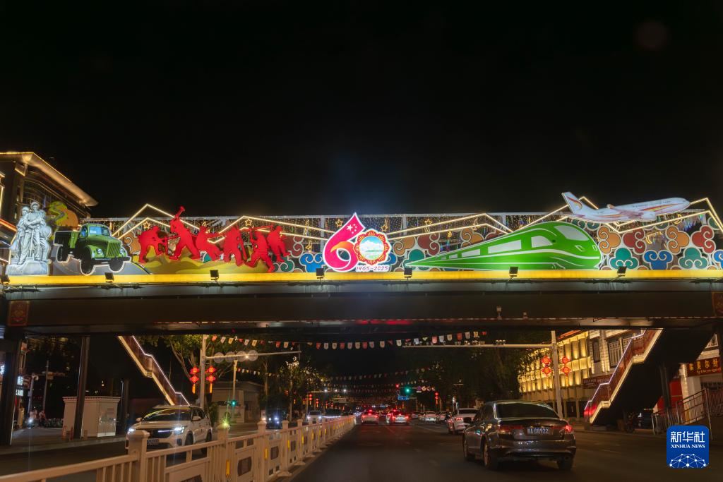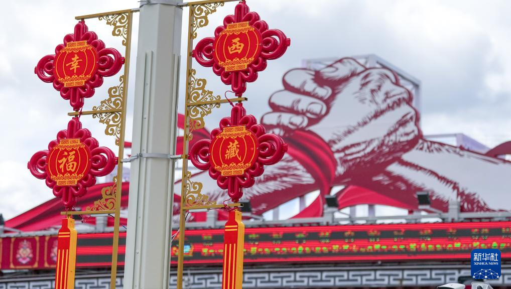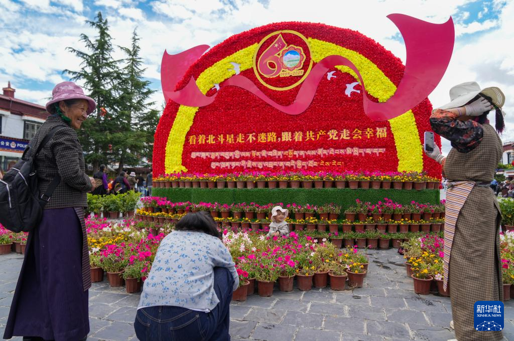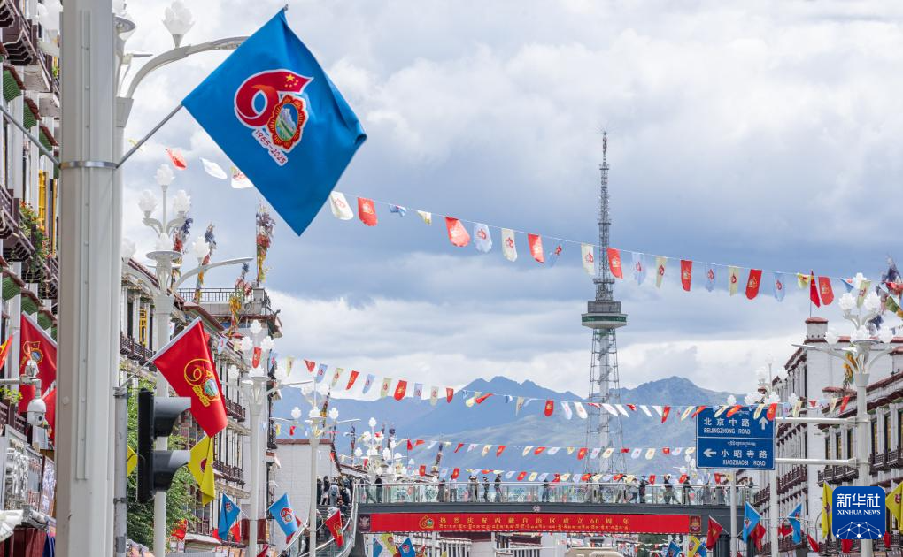 在庆祝西藏自治区成立60周年之际,拉萨街头张灯结彩,处处洋溢着喜庆氛围。