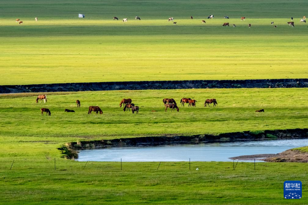 8月19日,在内蒙古呼伦贝尔市陈巴尔虎旗,马群在莫尔格勒河畔吃草。