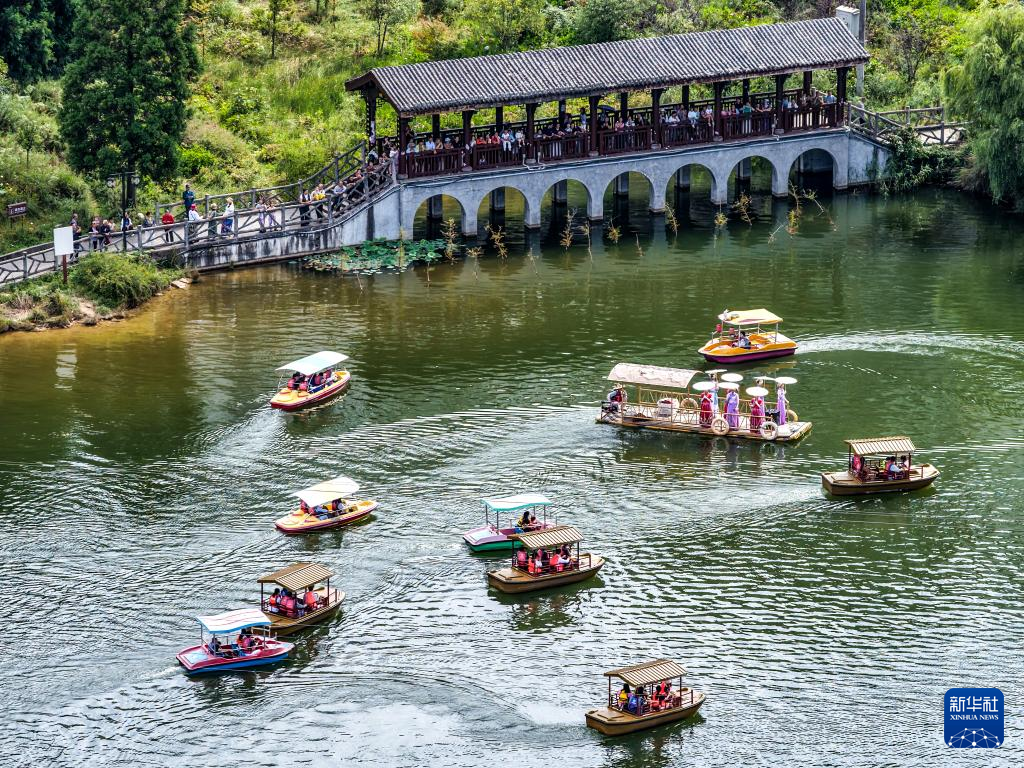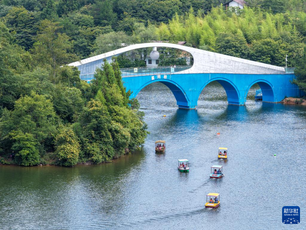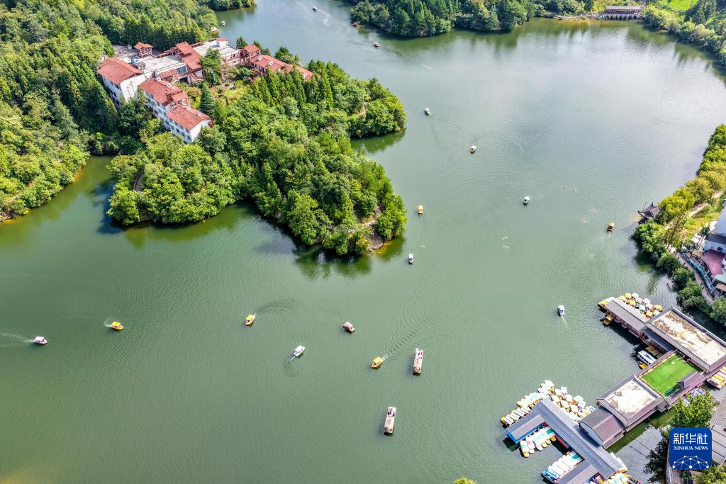 8月21日,游客在黄水镇月亮湖景区泛舟游玩(无人机照片)。