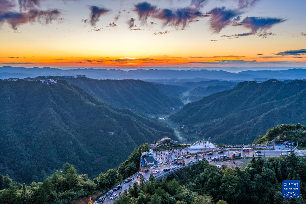 8月20日,游客在黄水镇环湖路观景台欣赏晚霞景色(无人机照片)。