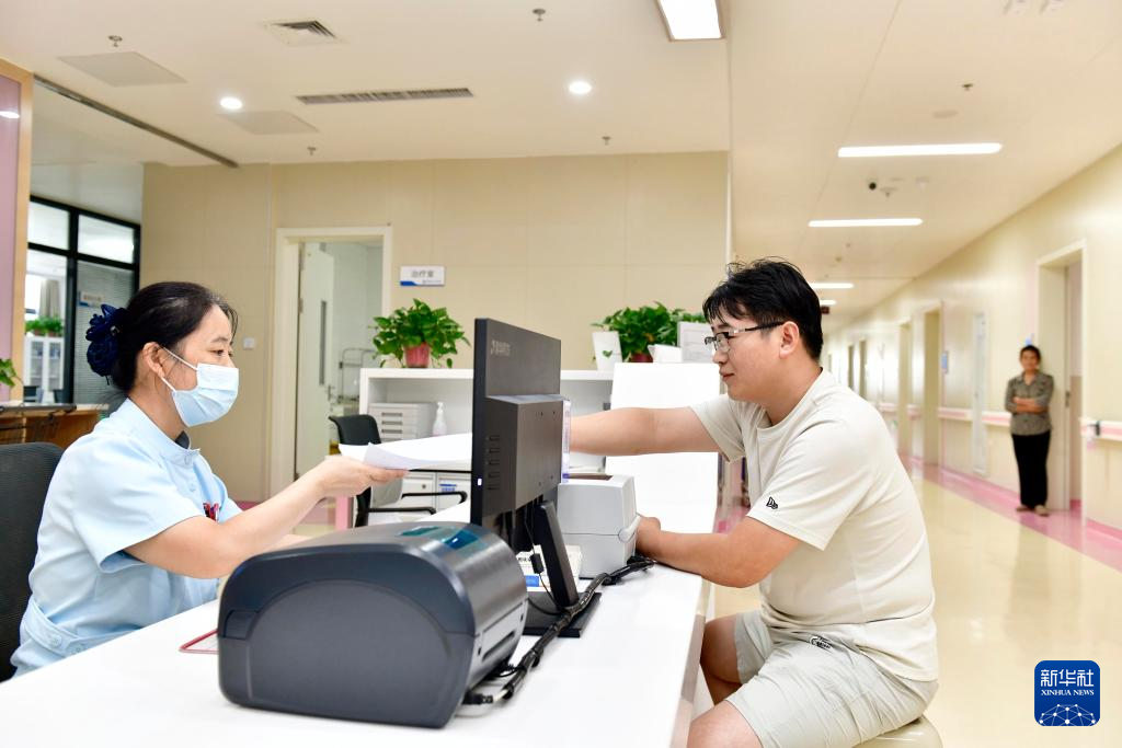 8月21日,在郓城县人民医院产科护士站,工作人员在为产妇家属做诊间医保结算。