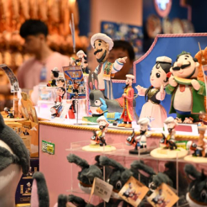 8月21日,游客在乌鲁木齐大巴扎步行街选购文创产品。