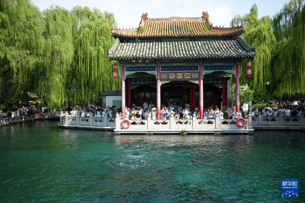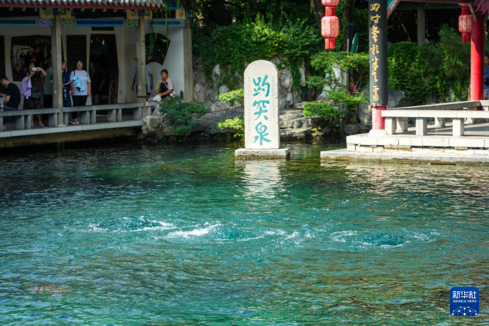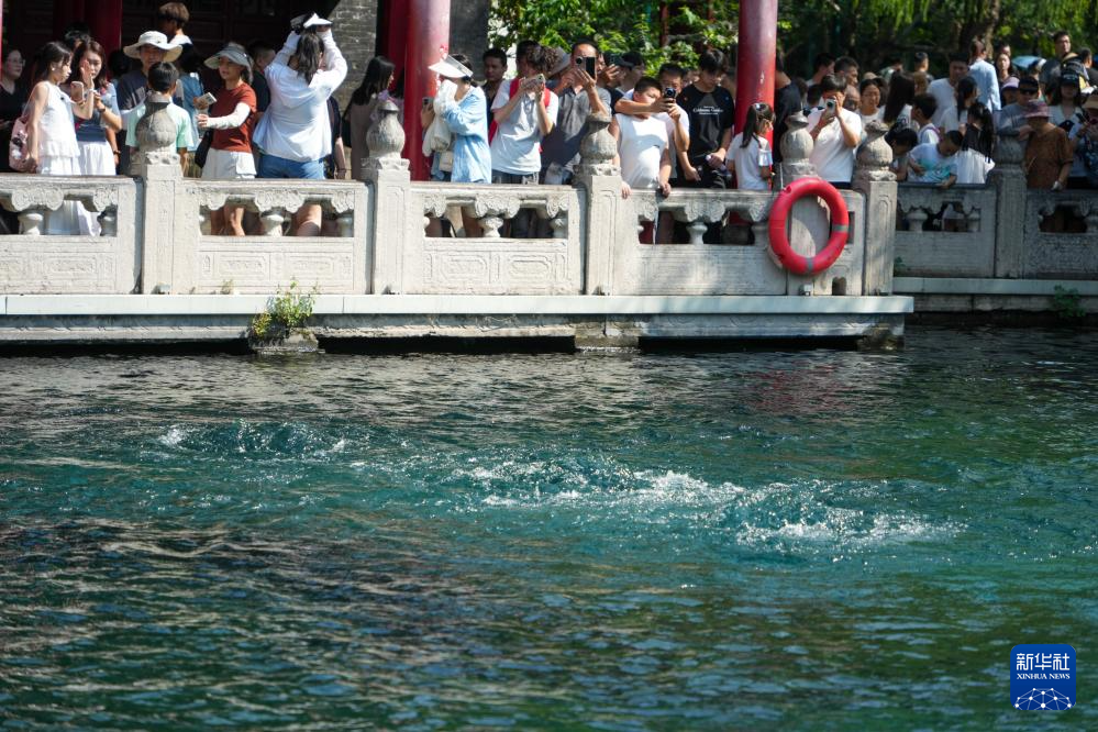 近日,受此前降雨影响,山东省济南市趵突泉地下水位攀升至28.90米以上,泉水喷涌有力,重现“水涌若轮”美景。