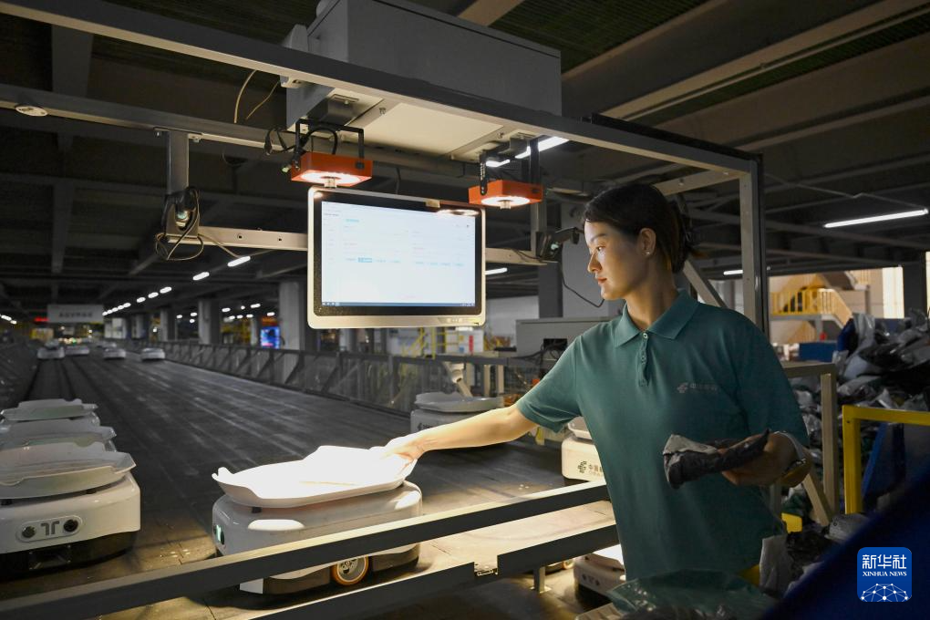 8月19日,在中国邮政集团有限公司安徽省合肥邮区中心,工作人员将快递包裹放置在智能分拣机器人上。