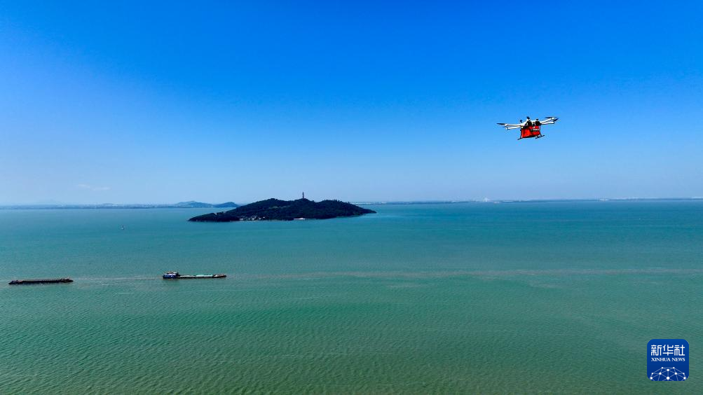 8月19日,在安徽省合肥市巢湖上空,无人机在配送快递包裹(无人机照片)。