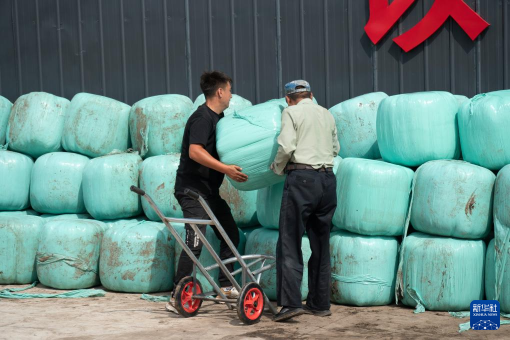 8月1日,蒙源农牧业集团有限公司工人在堆放全混合日粮成品。