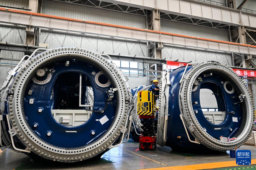 这是7月29日在包头市明阳新能源智能制造产业园总装车间拍摄的风机主机。