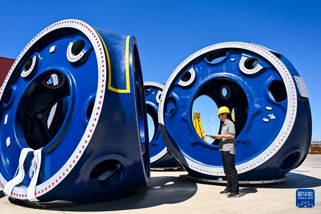7月29日,工人在包头市明阳新能源智能制造产业园内查看风机组件情况。