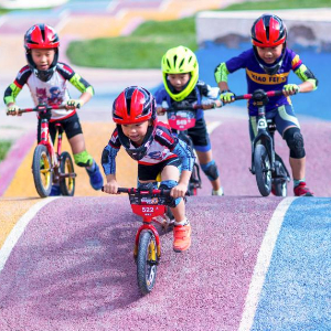 8月22日,甘肃省张掖市一处彩虹泵道骑行区,佩戴护具的“小骑士”在波浪起伏的泵道上骑行。