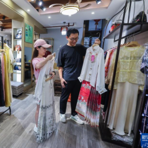 8月26日,游客在嘉兴市南湖区月河历史街区的一家店里挑选传统服饰。