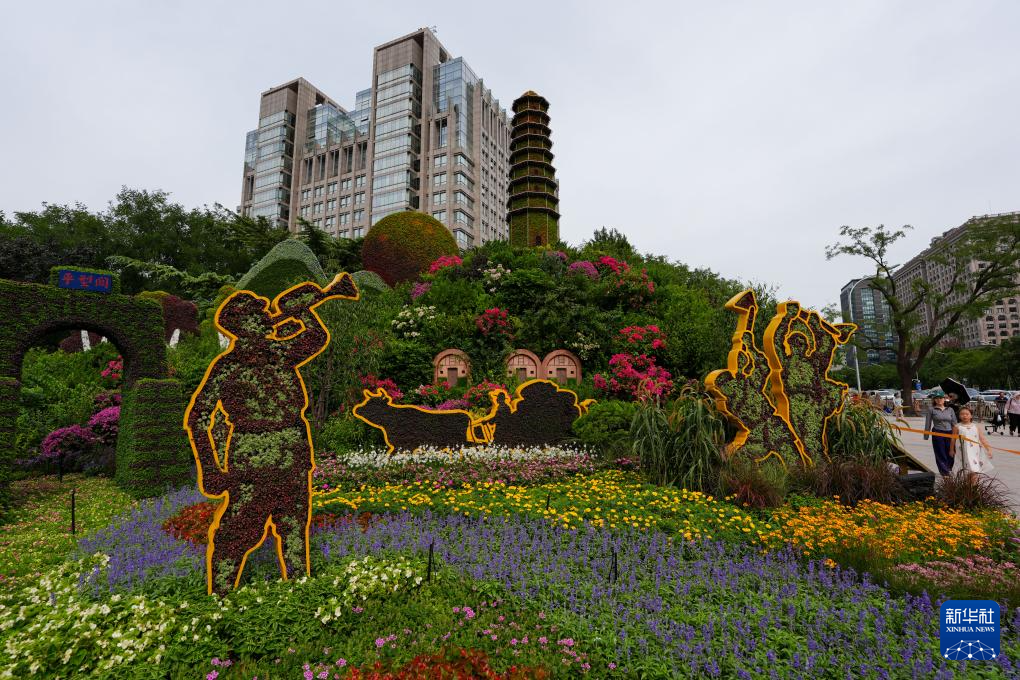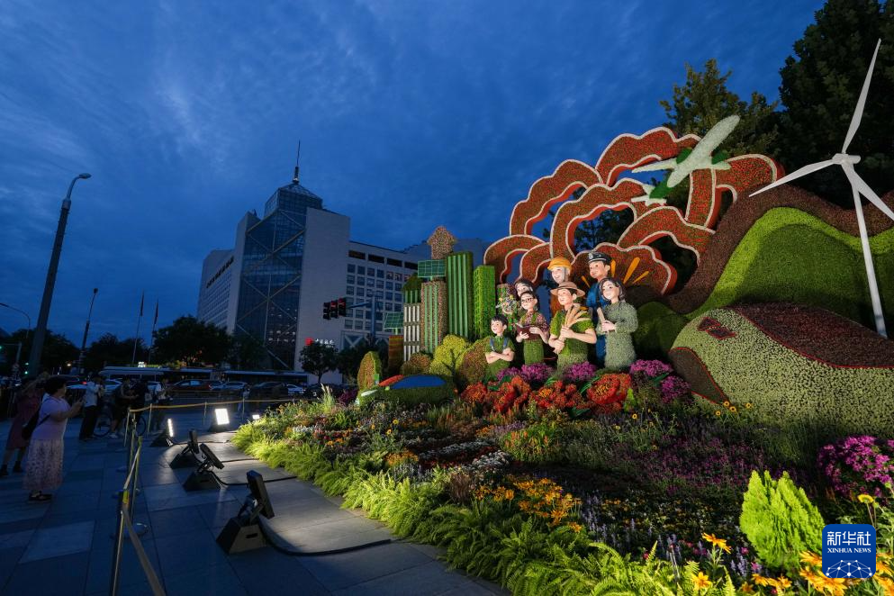 8月26日,人们在北京复兴门参观“美好明天”花坛。