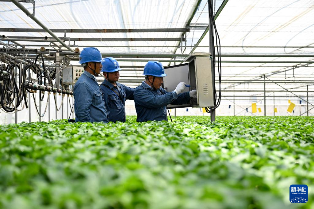 8月26日,在和县绿缘温室科技有限公司,国网马鞍山供电公司的工作人员在检修电力设施保障企业用电需求。