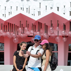 8月27日,在意大利威尼斯利多岛,影迷在电影宫前合影留念。