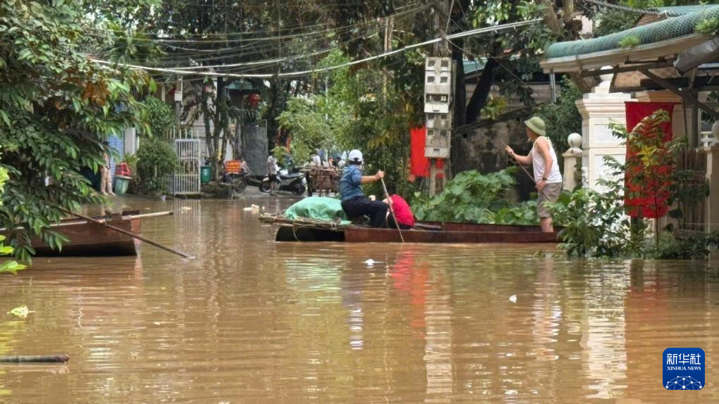 8月26日,在越南北部清化省,人们在洪水中乘船出行。
