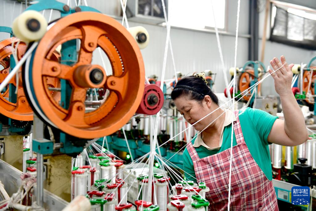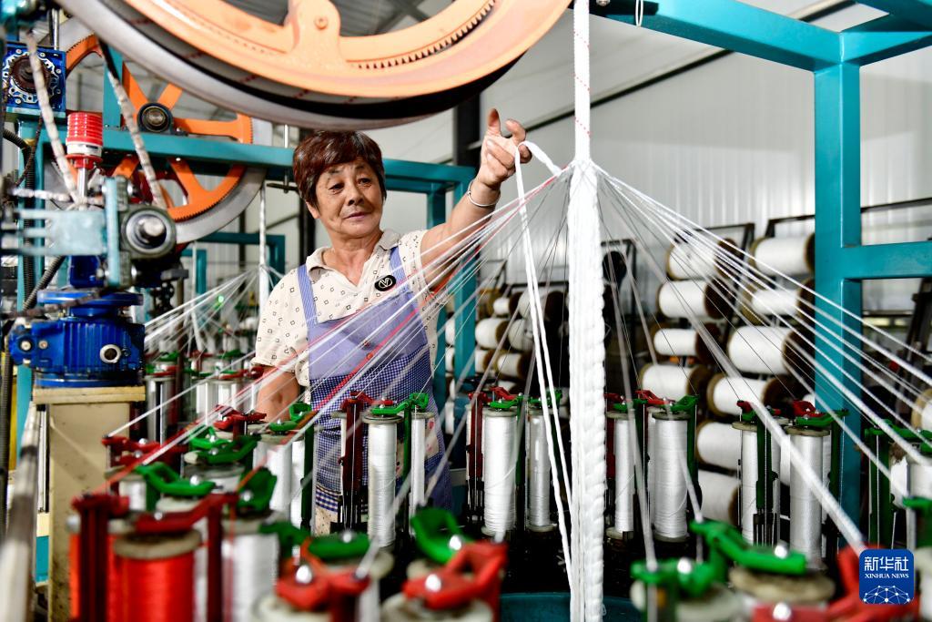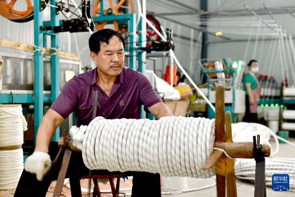 8月27日,在滨州市惠民县李庄镇一处“红网工坊”,村民在加工安全绳。