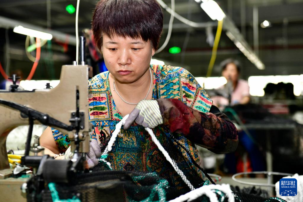 8月27日,在滨州市惠民县李庄镇一处“红网工坊”,村民在加工海参养殖网。