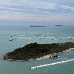 8月27日,游客在海南省三亚市乘坐游艇出海游玩(无人机照片)。
