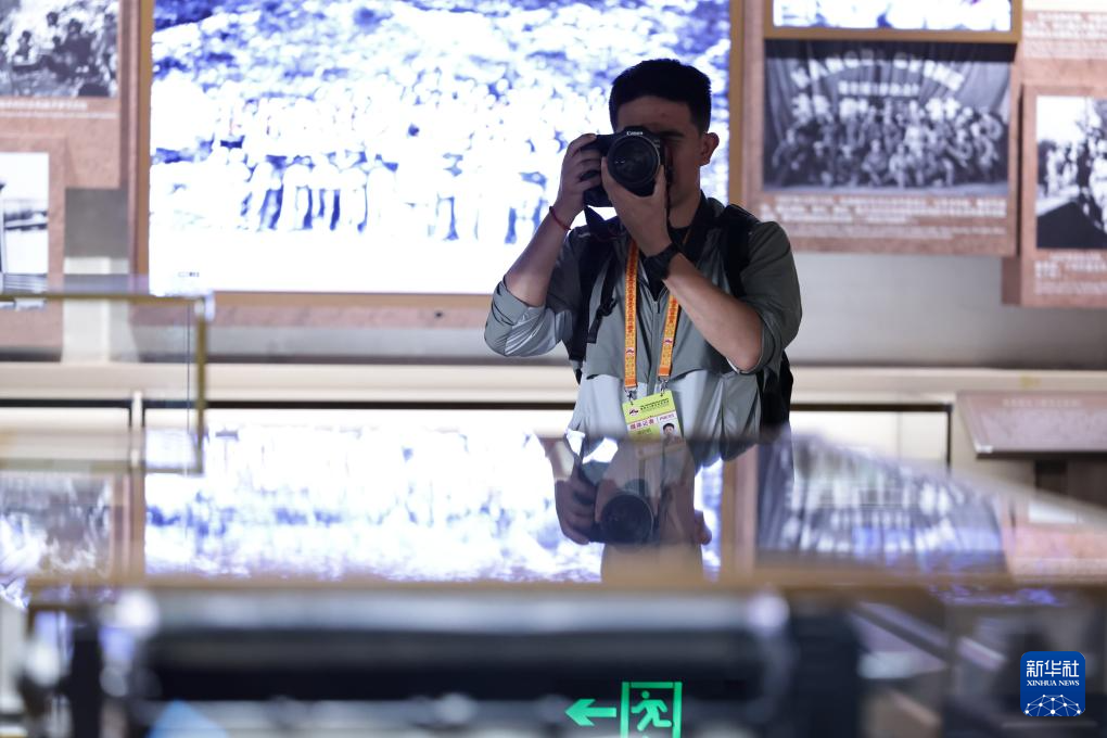 8月27日,中外媒体记者在中国人民抗日战争纪念馆内采访。