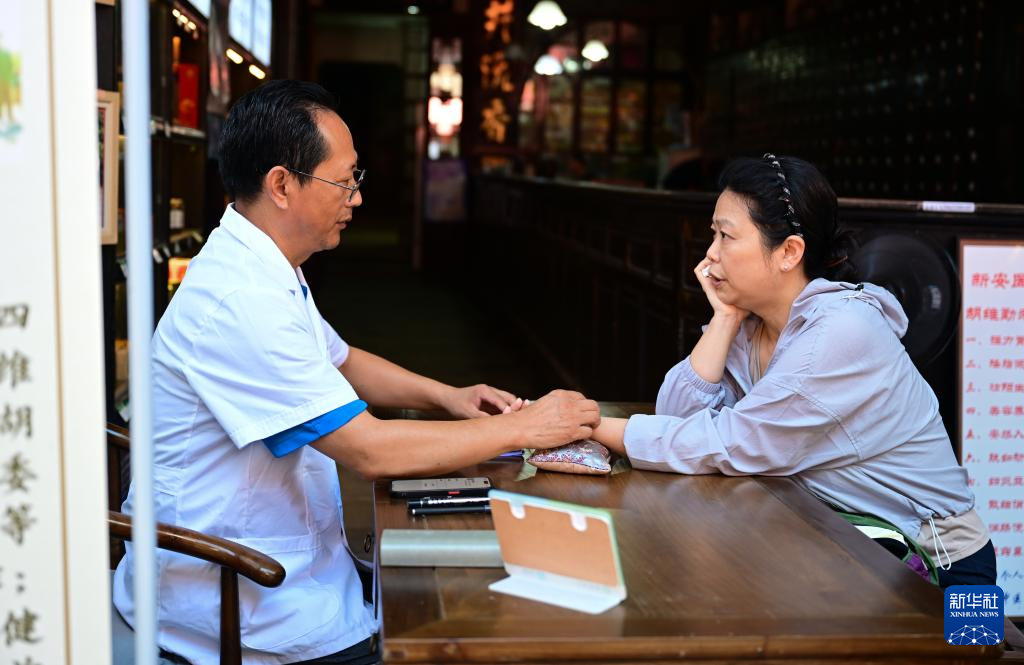 8月28日,在位于黄山市屯溪区的同德仁药店,坐诊医师为游客把脉。