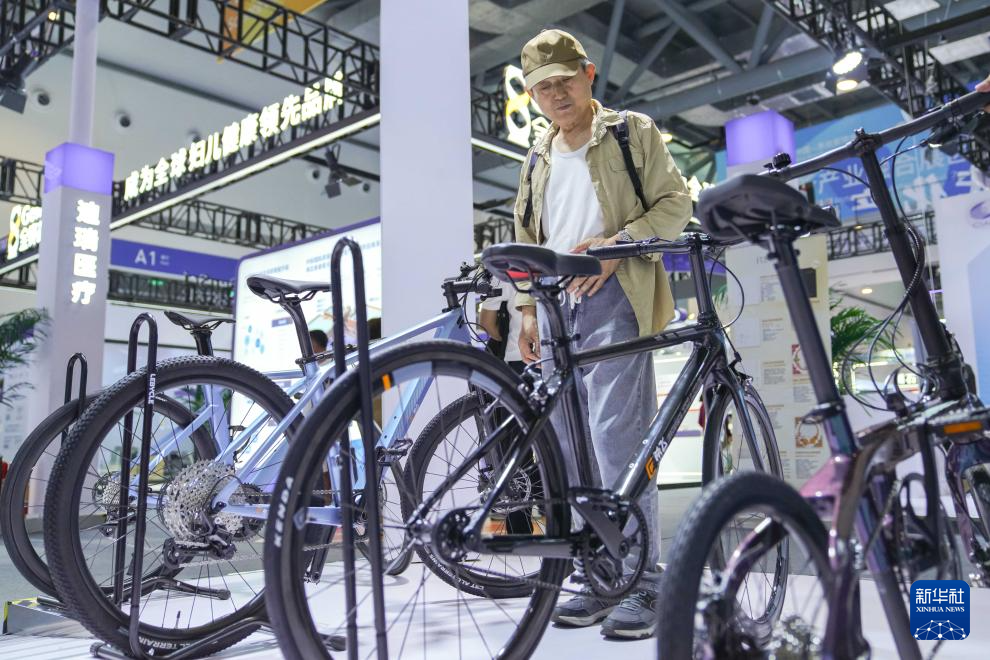 8月28日,参观者在第十五届中国—东北亚博览会吉林现代化产业展区参观展出的碳纤维自行车产品。