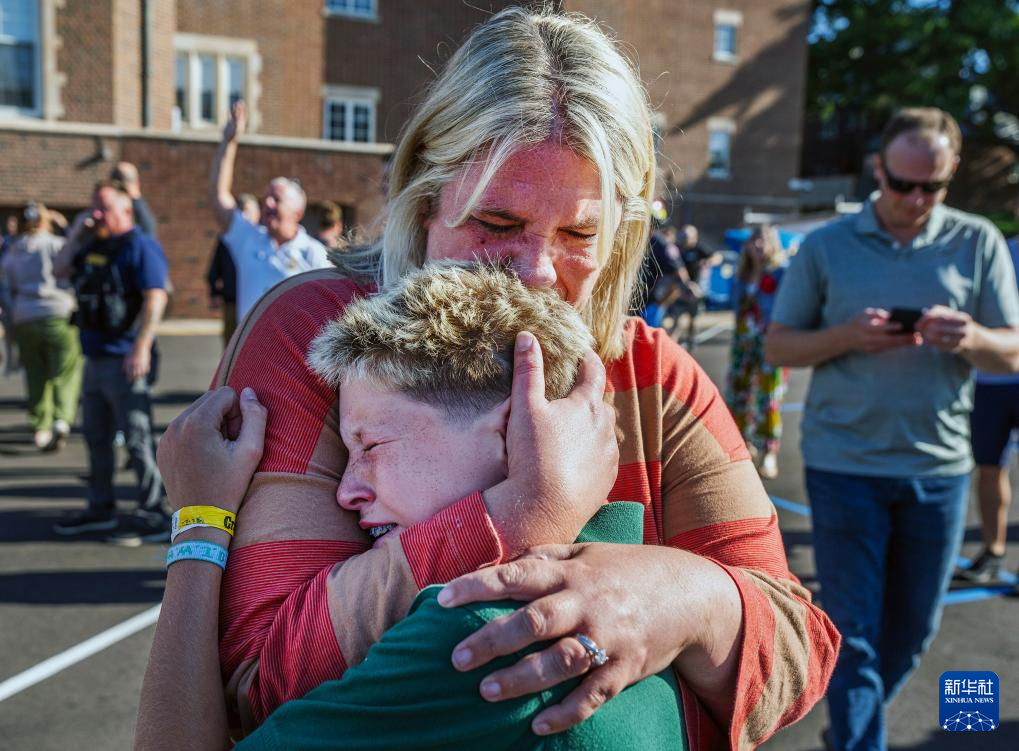 8月27日,在美国明尼苏达州明尼阿波利斯市南部一所学校,一名母亲安慰自己的孩子。
