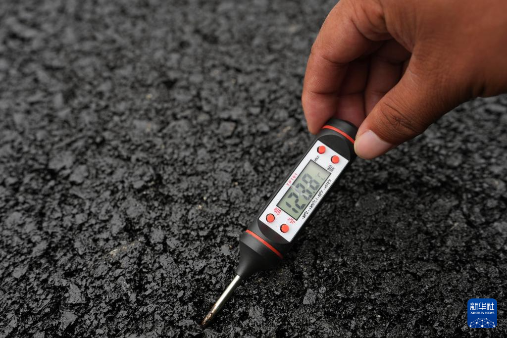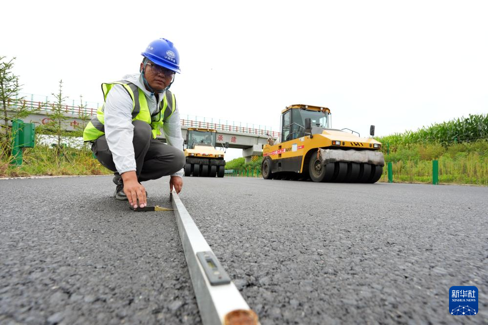 8月28日,在铁科高速公路延寿县至尚志界段主线,工作人员操作机械设备进行沥青摊铺收尾作业。