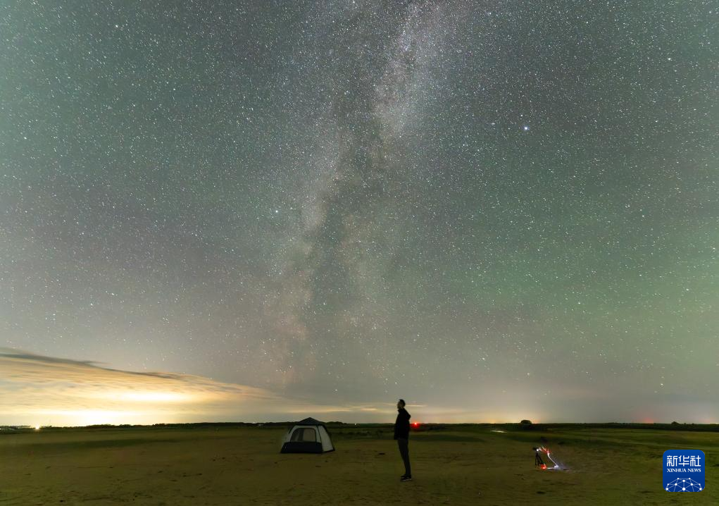 在黑龙江省佳木斯市桦川县,星空摄影爱好者在观赏银河和两侧的牛郎星、织女星(8月21日摄)。