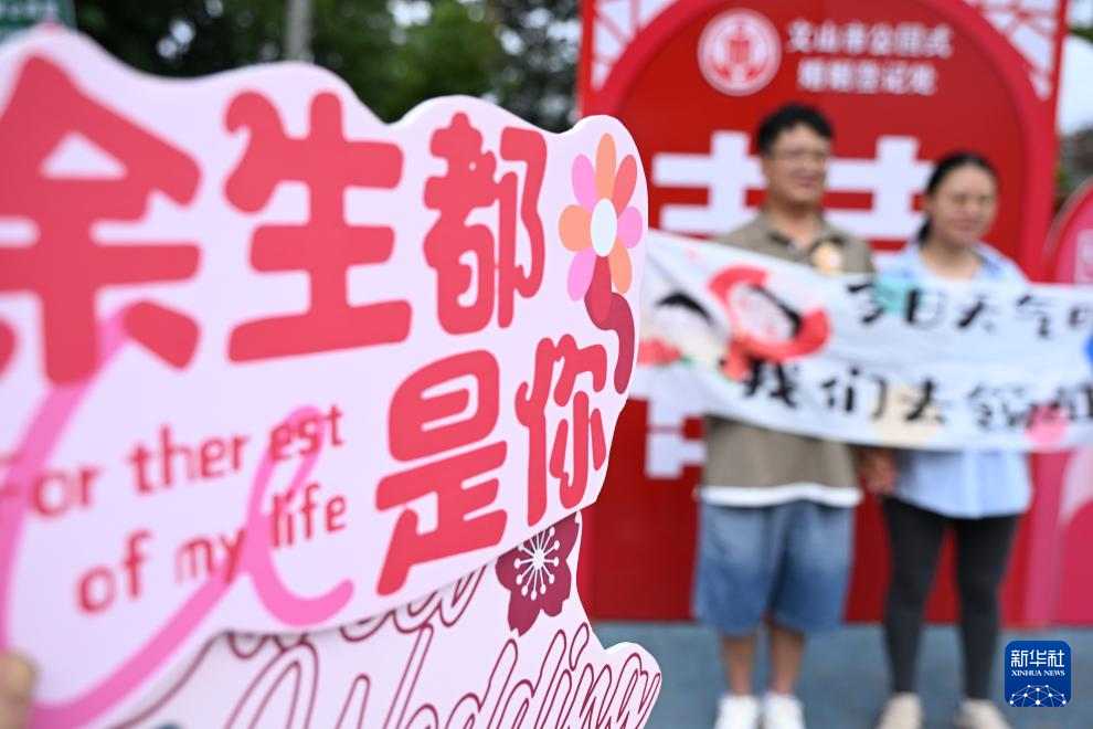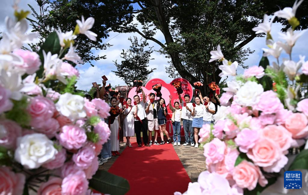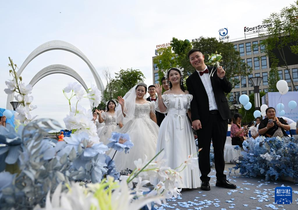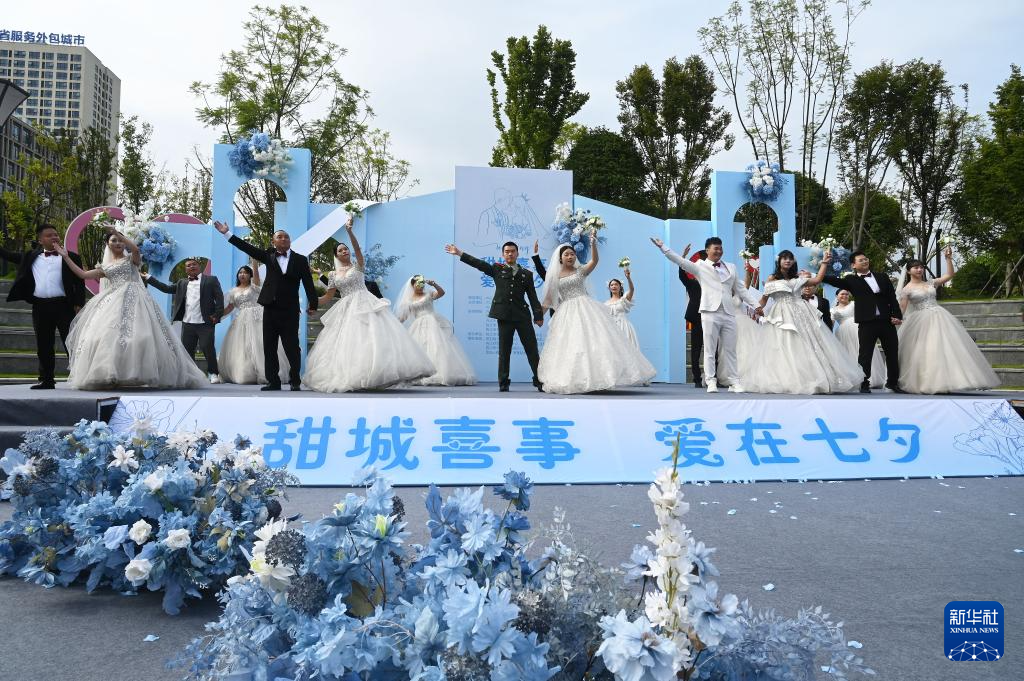 8月29日,新人们在四川省内江市东兴区甜蜜公园参加“甜城喜事 爱在七夕”集体婚礼。