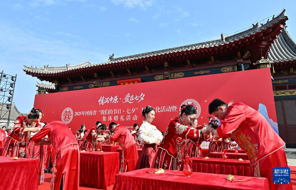 8月29日,在河南商丘古城举行的七夕集体婚礼上,新人们行对拜礼。