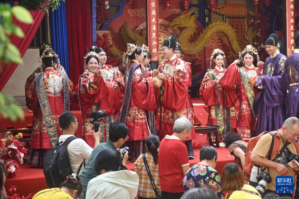8月29日,在四川省内江市隆昌市云顶古寨,新人向观礼嘉宾分发喜糖。