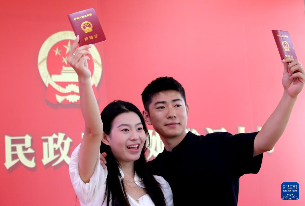 8月29日,在山东省滨州市惠民县民政局婚姻登记处,一对新人领取结婚证后留影。