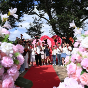 8月29日,在云南省文山市七花广场,新人们在集体婚礼上留影。