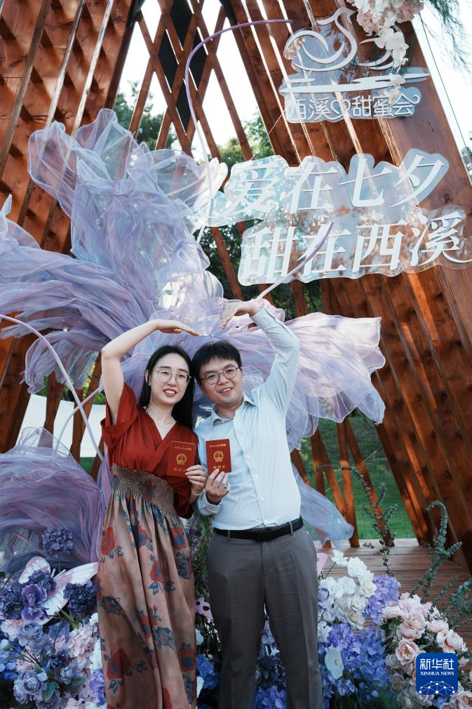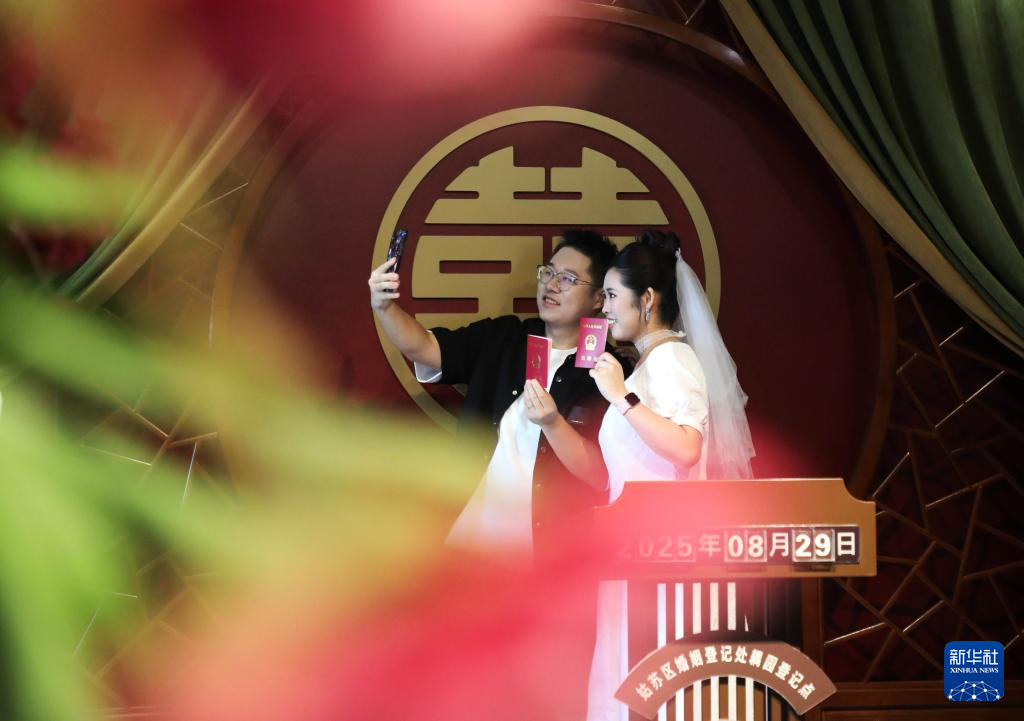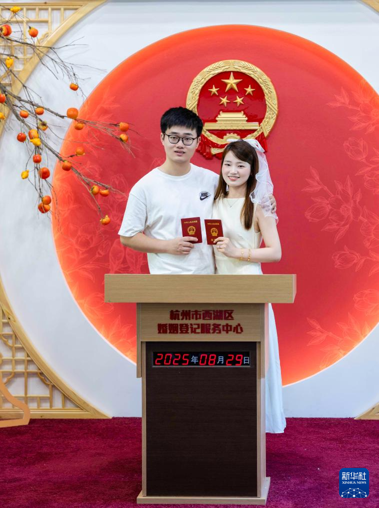 8月29日,在浙江省杭州市西湖区婚姻登记服务中心设立在西溪湿地的喜堤婚姻登记处,一对新人领证后合影留念。