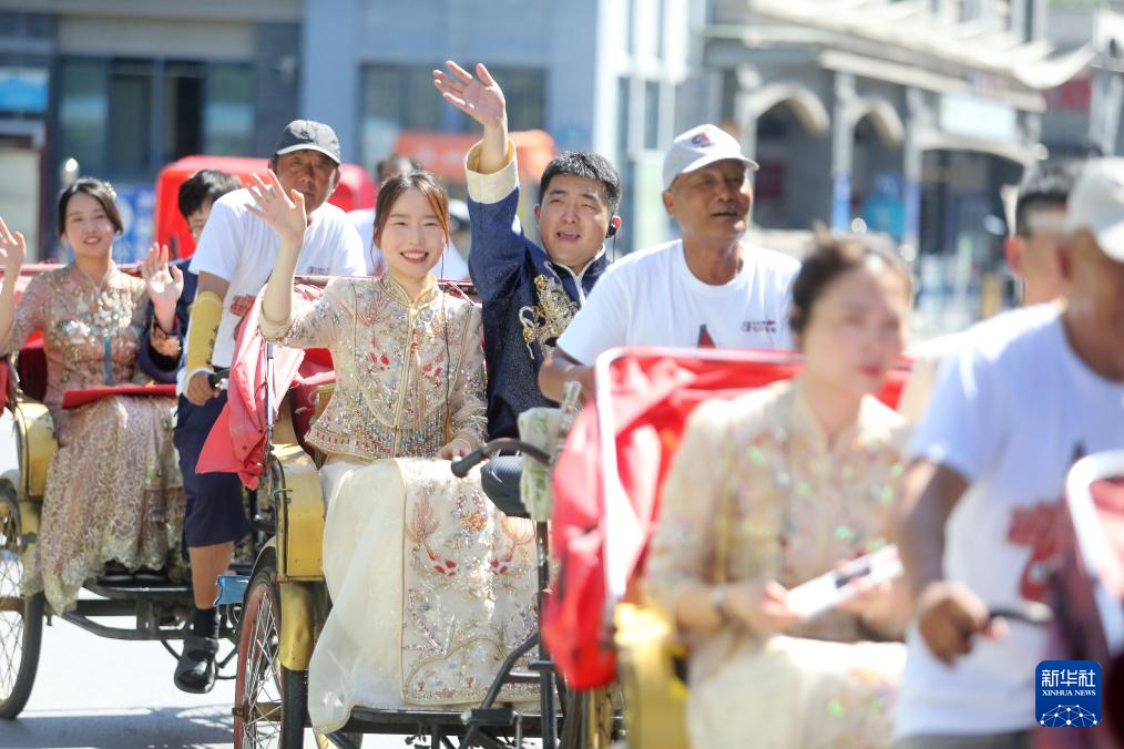 8月29日,在江苏省扬州市何园景区,参加传统婚礼的新人乘坐人力三轮旅游观光车游览古城。