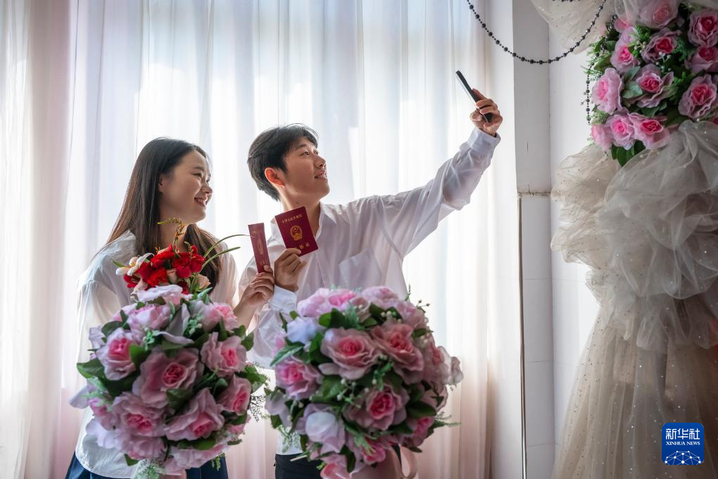 8月29日,在福建省厦门市湖里区民政局婚姻登记处,一对新人领取结婚证后拍照留念。