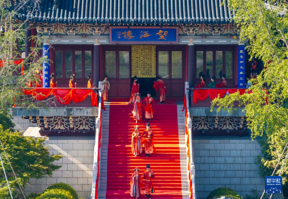 8月29日,新人们在江苏省泰州市海陵区凤城河畔望海楼参加集体婚礼(无人机照片)。