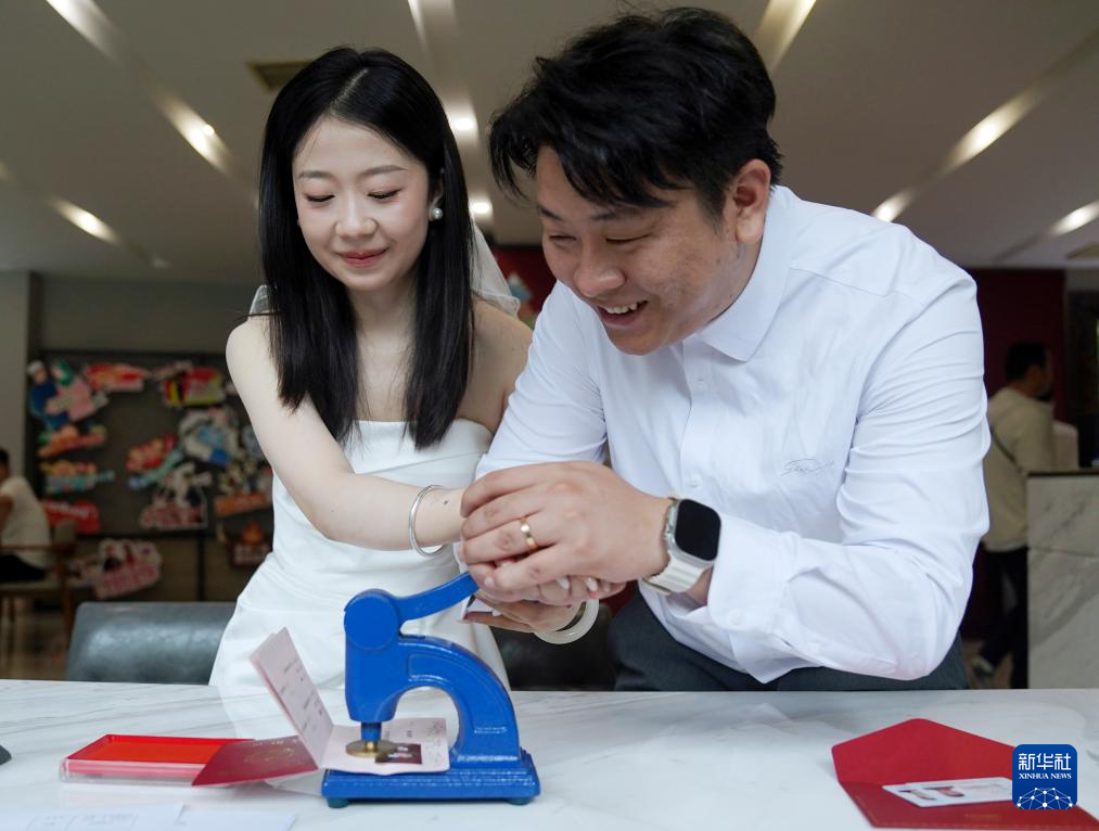 8月29日,在云南省昆明市西山区民政局云安会都婚姻登记点,一对新人携手在结婚证上盖钢印。