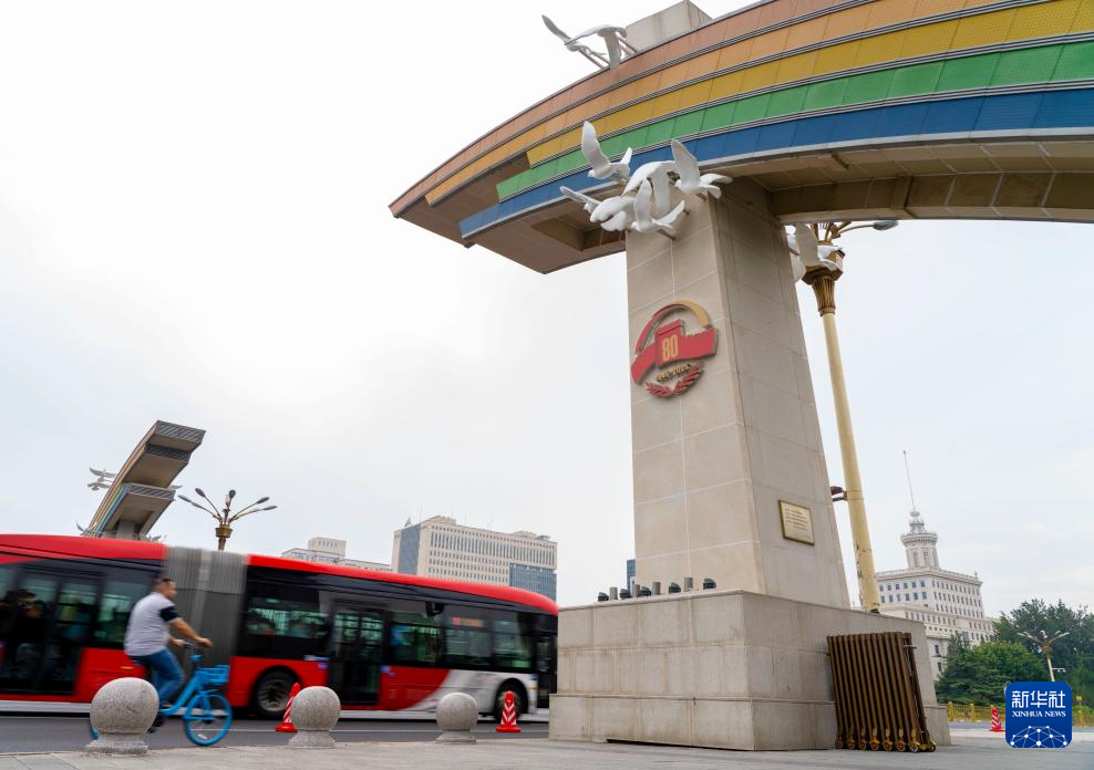 8月29日在复兴门外大街拍摄的纪念抗战胜利80周年主题横幅。