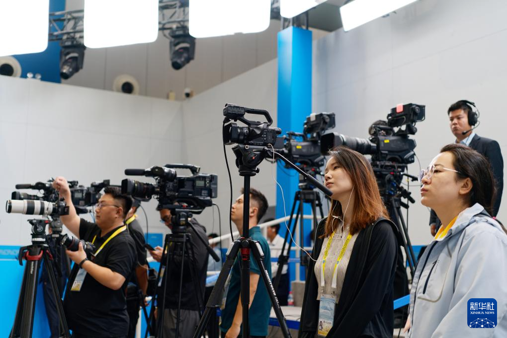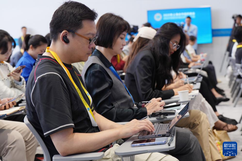 8月30日,在天津梅江国际会展中心,2025年上海合作组织峰会新闻中心举行上合组织睦邻友好合作委员会吹风会,上海合作组织睦邻友好合作委员会秘书长左洪波介绍该组织民间交往与合作,以及睦委会推进该组织民间外交工作情况,并回答记者提问。这是记者在吹风会现场工作。