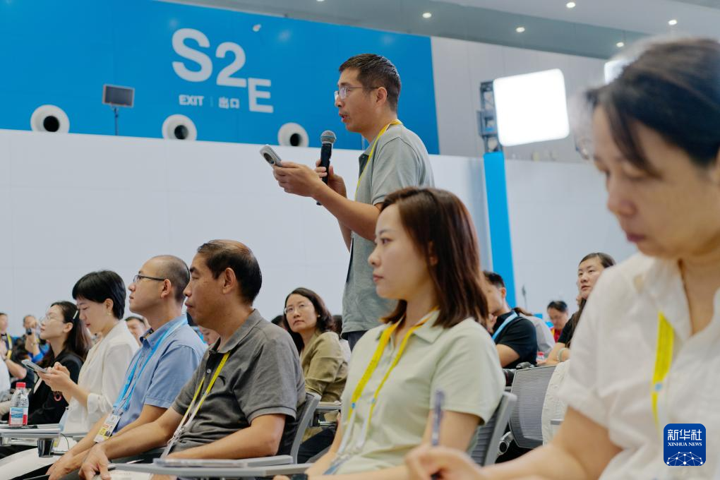 8月30日,在天津梅江国际会展中心,2025年上海合作组织峰会新闻中心举行上合组织睦邻友好合作委员会吹风会,上海合作组织睦邻友好合作委员会秘书长左洪波介绍该组织民间交往与合作,以及睦委会推进该组织民间外交工作情况,并回答记者提问。这是记者在吹风会现场提问。