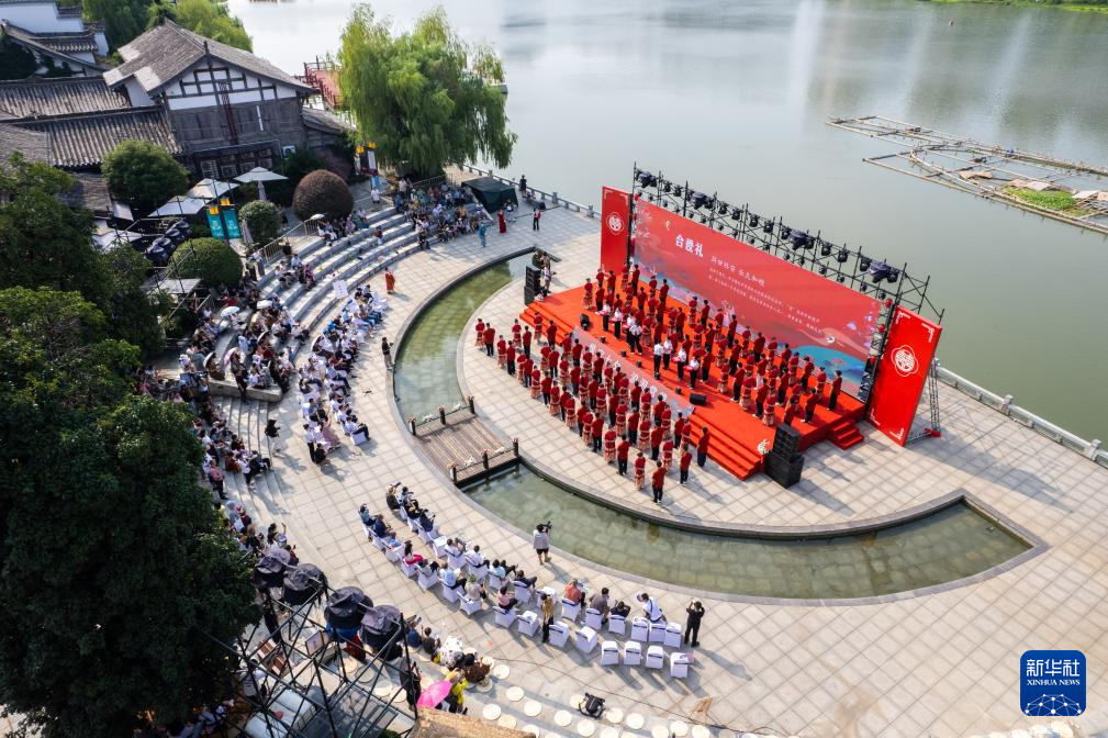 这是8月30日在常德河街春秋广场拍摄的集体婚礼仪式现场(无人机照片)。