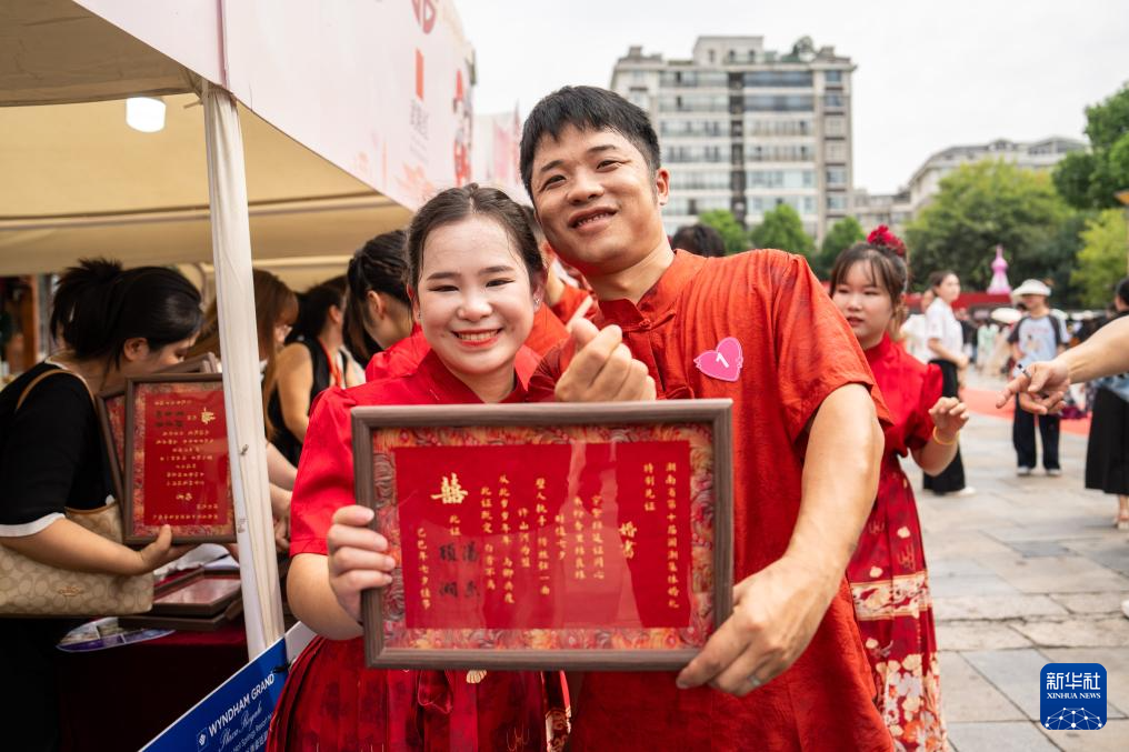 8月30日,新人在常德河街春秋广场的集体婚礼仪式现场展示婚书。