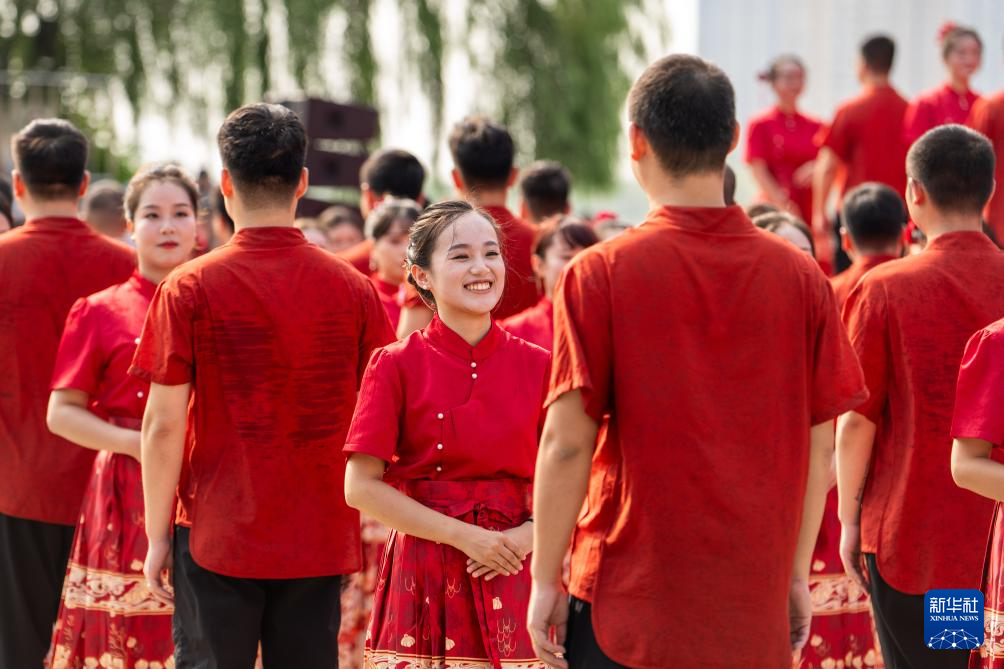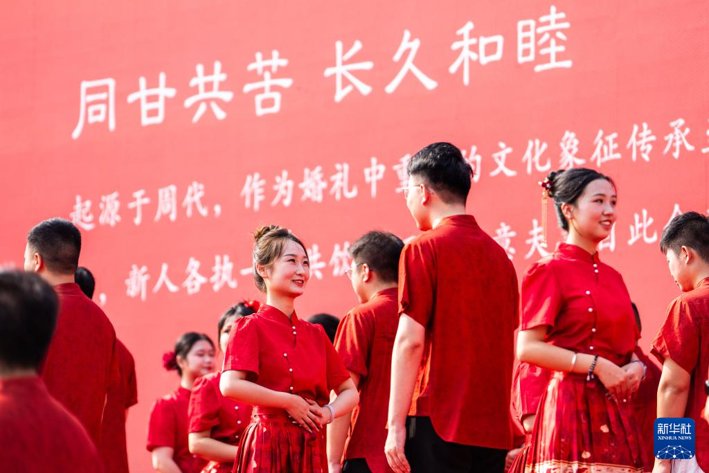 8月30日,湖南省第十届国潮集体婚礼在常德河街春秋广场举行, 77对新人身着简约中式婚服,在喜庆浪漫的氛围中交换信物、许下爱的誓言,与家属代表共同见证这一幸福时刻。