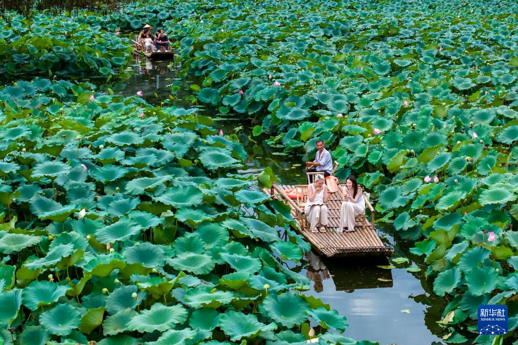 8月21日,游客在黄山市徽州区呈坎村体验竹筏漂流(无人机照片)。