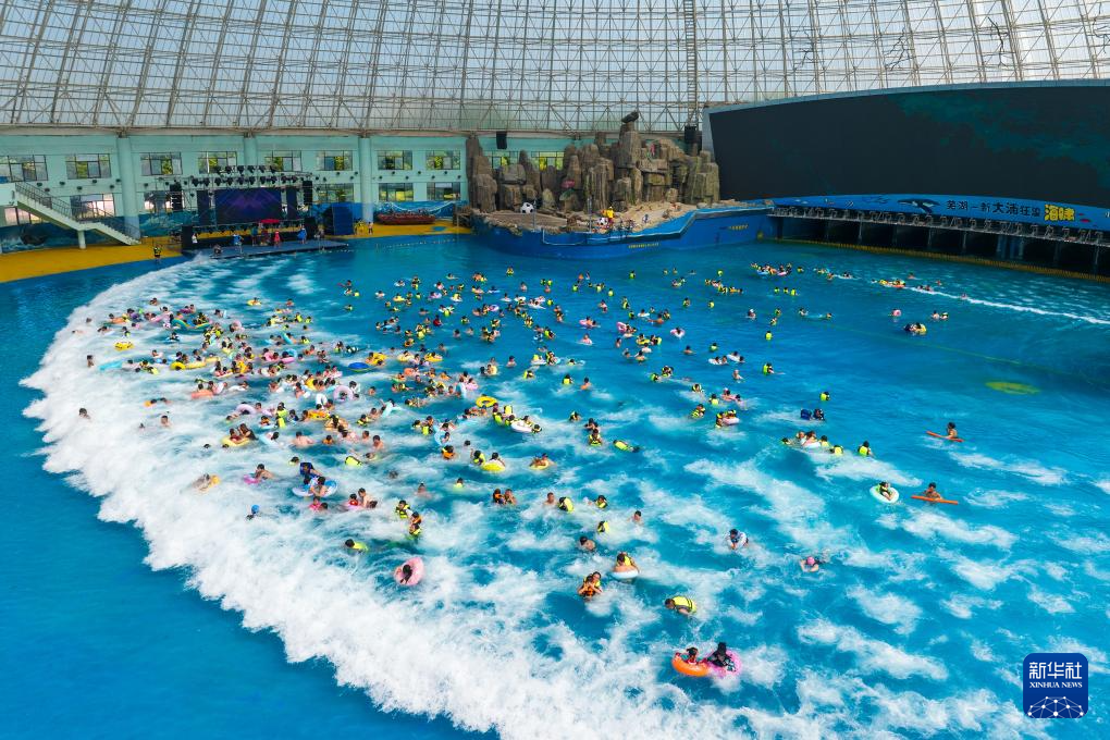 8月3日,人们在芜湖市南陵县一处水上运动场馆内体验冲浪戏水(无人机照片)。