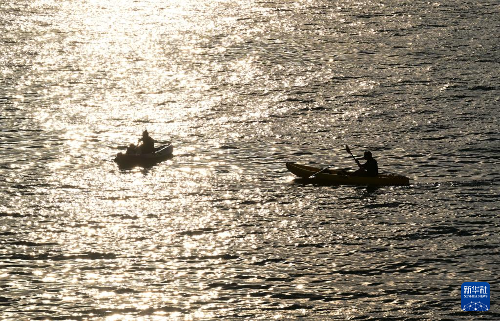 8月28日,游客在黄山市黄山区太平湖一处亲水平台观赏落日(无人机照片)。
