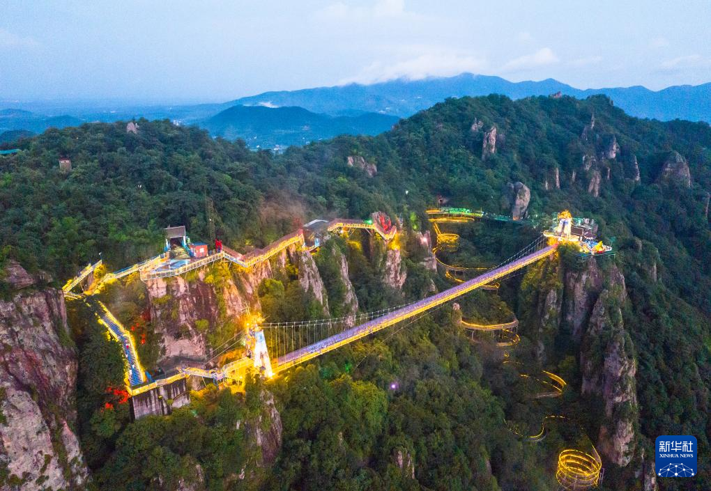 7月12日,游客在位于芜湖市繁昌区的马仁奇峰景区体验“清凉夜游”主题活动(无人机照片)。