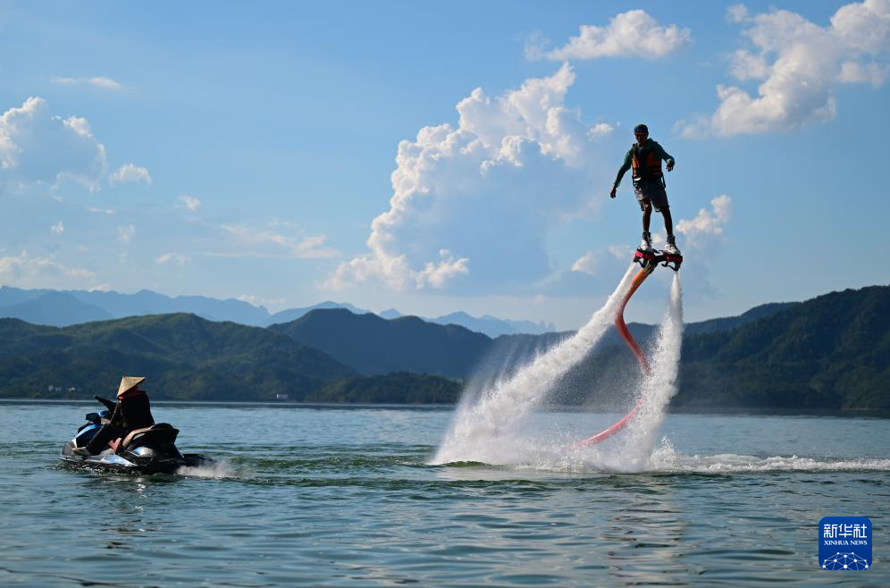 8月28日,游客在黄山市黄山区太平湖水上运动中心体验水上项目。